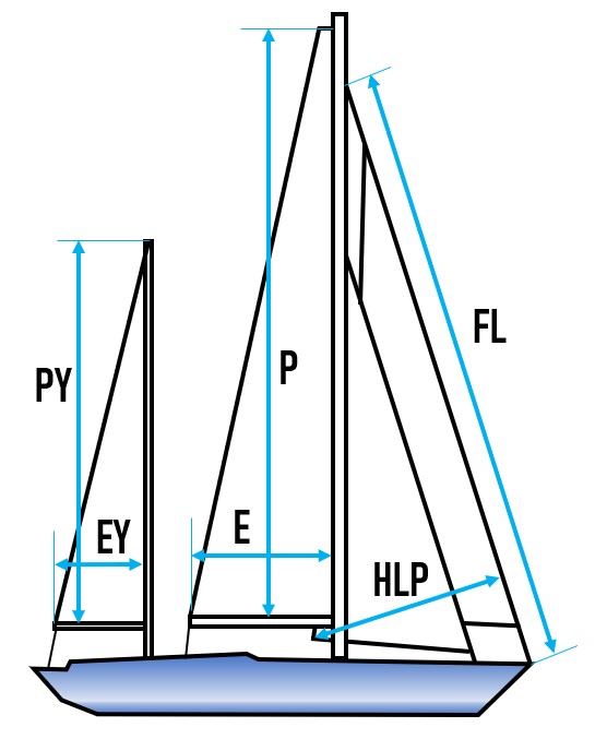 HLP Cotre : la plus courte distance entre le point d’écoute le plus en arrière de toute voile d’avant établie dans l’axe du bateau et le guindant de la voile d’avant le plus en avant, qui peuvent être établies simultanément, en course, sur un bord de louvoyage.