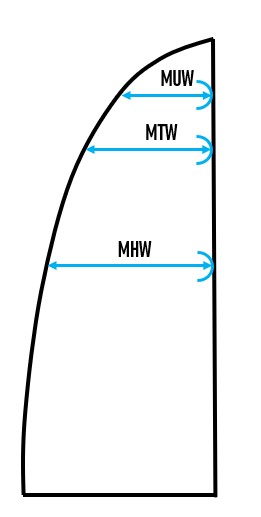 MUW : Largueur aux sept-huitièmes maximum permise de grand-voile. Si un point aux sept-huitièmes de chute ne peut pas être trouvé sur la chute, le point de drisse arrière sera pris comme point aux sept-huitièmes de chute.