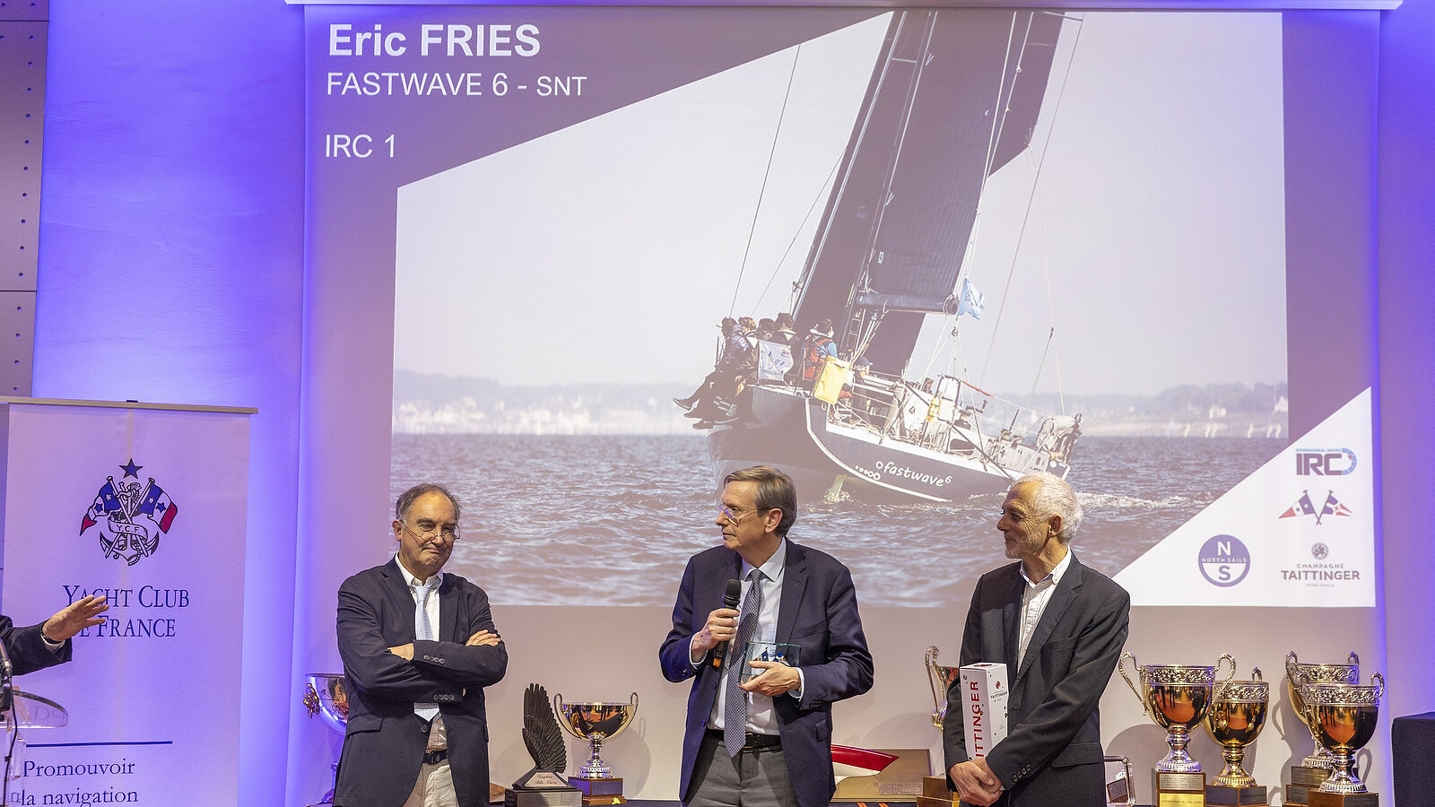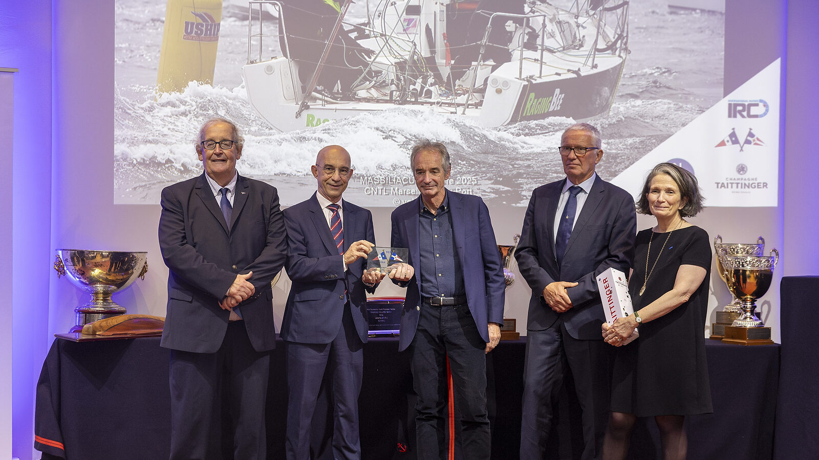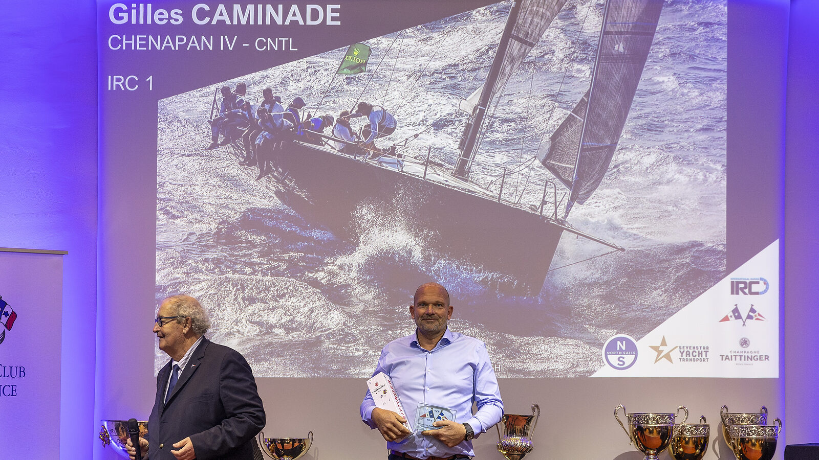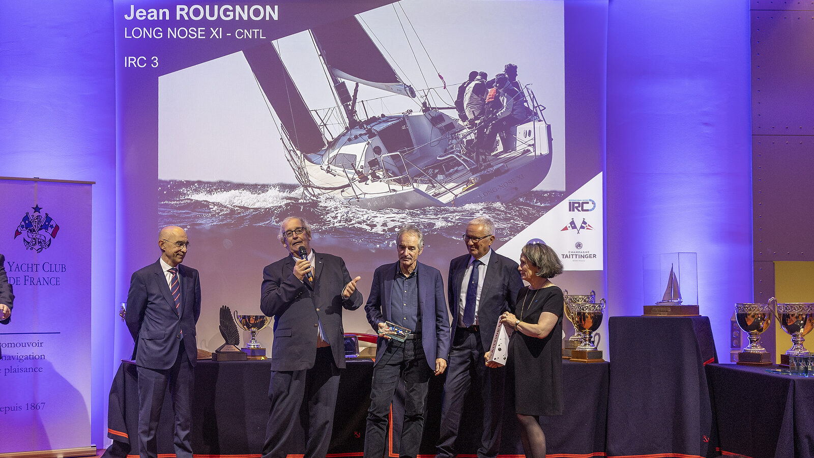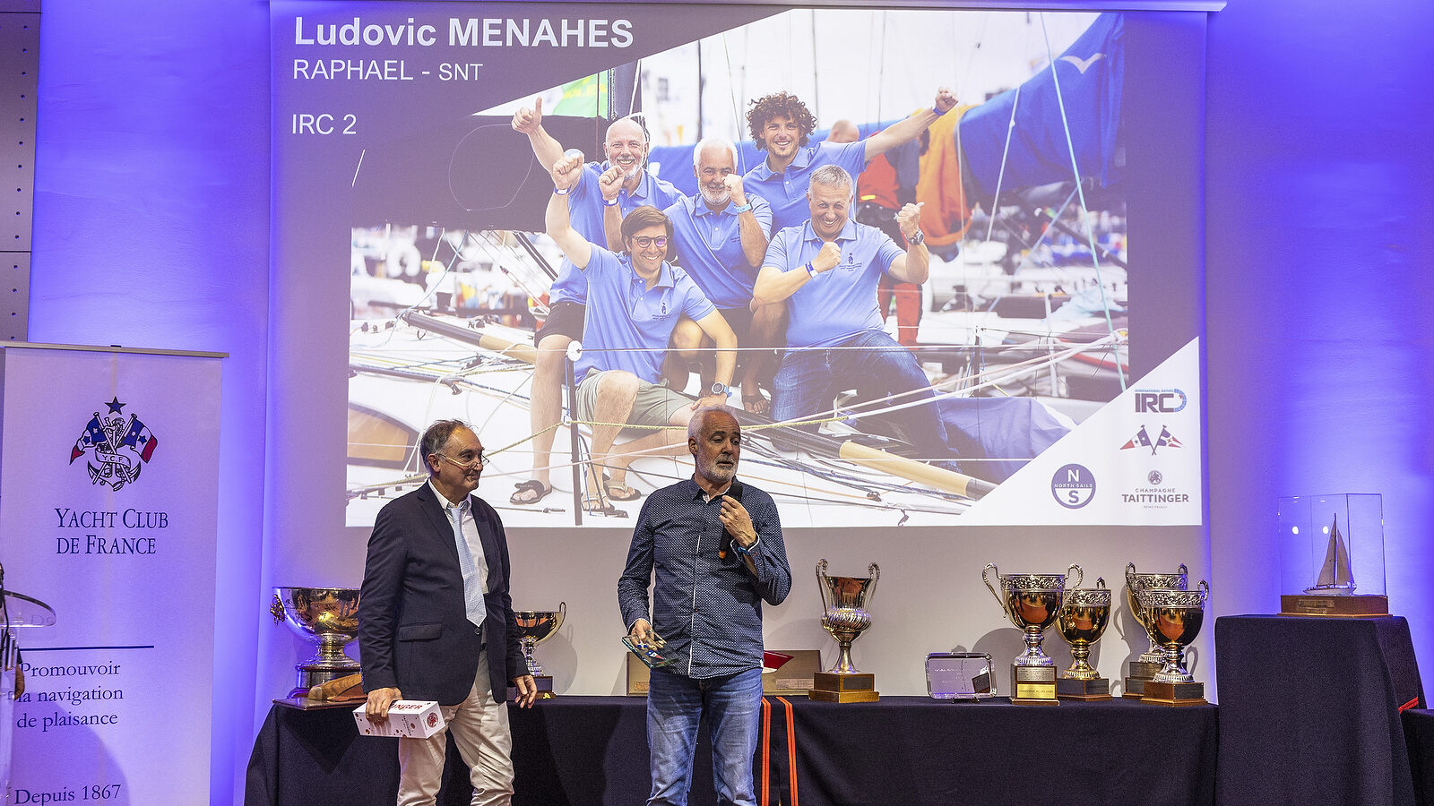 Jean Rougnon reçoit des mains de Jean-Philippe Gallois, de Northsails et membre du YCF, le Trophée NORTHSAILS pour le plus de manches gagnées aux championnats IRC 2025, avec un bateau issu d’un podium des Championnats IRC 2025 et qui a gagné le plus de manches dans le cadre des courses de ces Championnats, Long Nose XI (Farr 36)