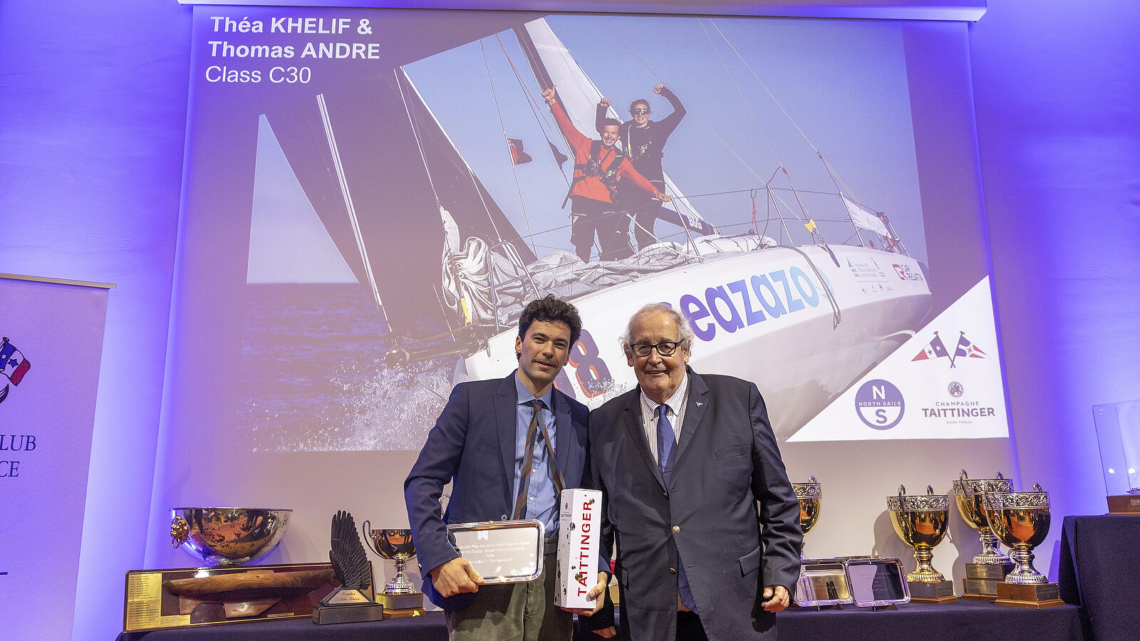 Théa Khelif et Thomas André reçoivent le Prix Spécial Pôle Course du YCF, comme Champion du Monde Double Mixte Class 30 Performance particulière, sur un Class 30.